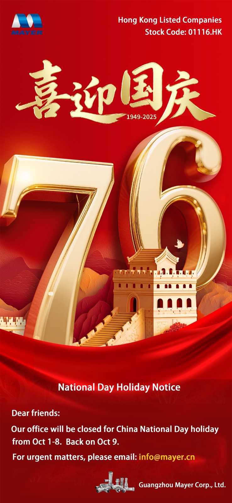 For any urgent matters, please feel free to email us at info@mayer.cn. While we may not respond immediately, we will get back to you as soon as possible upon our return.