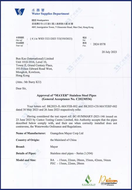 Recently, Mayer stainless steel pipes have passed the WSD certification of the Hong Kong Water Department (hereinafter referred to as "Hong Kong WSD certification"), which is a recognition of Mayer's continuous pursuit of excellent quality and technological innovation, and will further enhance the competitiveness of Mayer's products in the market.